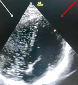 Abb. 5: Bildausschnitt der Transthorakalen Echokardiographie (TTE) beim o.g. verunfallten Taucher. Der rechte Ventrikel (rechte Herzkammer, weißer Pfeil, links im Bild) weist im Rahmen dieses Tauchunfalls eine deutliche Blasenlast (weiße Punkte bzw. Pünktchen) im Vergleich zum linken Ventrikel (linke Herzkammer, roter Pfeil, links im Bild) auf. In diesem Fall funktioniert der Lungenfilter gut, da die Blasen vom rechten Ventrikel via Lungenarterie (sauerstoffarmes, aber Stickstoffblasen-reiches Blut) zur Lunge transportiert werden, im Rahmen des alveolären Gasaustauschs abgeatmet werden und in diesem Fall fast Stickstoffblasen-armes (aber sauerstoffreiches) Blut via Lungenvenen über den linken Herzvorhof in den linken Ventrikel und sukzessive in den Kreislauf gelangen. © Dr. Dr. Philipp Stahl