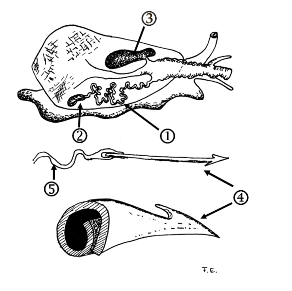 Unabhängig von ihrer Beutespezialisierung auf Würmer, andere Schnecken oder Fische besitzen Kegelschnecken einen gleichförmig aufgebauten Giftapparat. Er ist kompliziert und ein wahres Wunderwerk der Natur. Er besteht im engeren Sinne aus drei Teilen: der Giftblase, der Giftdrüse und den Giftpfeilen (siehe Abbildung 4). Die Giftdrüse ist als langer Schlauch ausgebildet (1), dessen hinteres Ende sich zu einem Reservoir, der Giftblase (2), erweitert, in dem das Gift gespeichert wird. Diese Giftblase hat eine muskulär aufgebaute Wand, die durch Kontraktion als Pumpe dient und das Gift in die vordere Schlauchöffnung in den Schlund drückt. Dort befindet sich der sogenannte „Radulasack“ (3), in dem die Giftpfeile gespeichert werden wie in einem Köcher. Diese sind ursprünglich modifizierte Produkte der Schneckenzunge (Radula), sogenannte Chitinzähnchen. Die Zähnchen sind formvollendet in mehrere Millimeter lange, hohle Harpunen oder Pfeile umgewandelt und mit Widerhaken versehen (4). Bei Bedarf wird ein Pfeil in den Schlund gedrückt, mit Gift armiert und durch Druck der Schlundmuskulatur auf das Beutetier geschossen, das rasch paralysiert und anschließend vollständig verschlungen wird. Eine solch „geladene Harpune“ durchdringt mühelos einen Tauchhandschuh und hat einen erstaunlich großen Radius. Also: Finger weg!!! Ein Giftpfeil dient zur einmaligen Verwendung, im Radulasack sind jedoch bis zu 20 Stück gespeichert. Schneller Nachschub ist also durchaus vorhanden.
