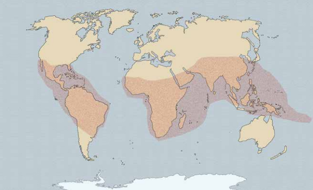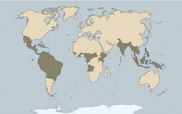 Abb. 3: Die weltweite Verbreitung der Malaria, in den Tropen und Subtropen, nicht oberhalb von 2500 respektive 1500 Metern. © Stephanie Naglschmid/ILVA