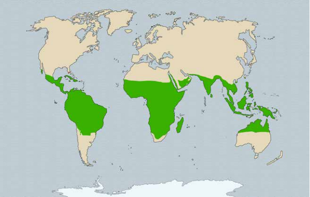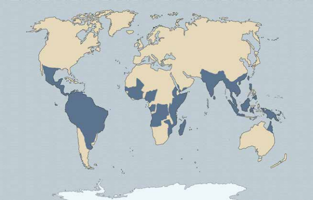 Abb. 1: Tropische Klimazone der Erde, nach Köppen; Strahler A. H. & Strahler A. N. (2005). © Stephanie Naglschmid/ILVA