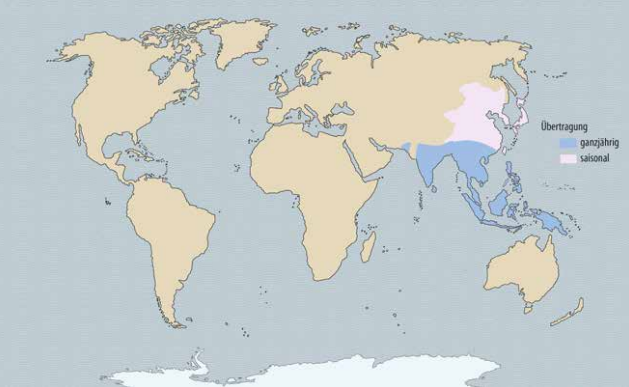 Die JE ist zusammen mit dem Gelbfieber eine der wenigen impfpräventablen Erkrankungen, die durch Mücken übertragen werden. Die Impfung wird zweimalig appliziert mit einem Mindestabstand an Tag 0 und 7. Nach der zweiten Dosis besteht eine Schutzwirkung von bis zu zwei Jahren, dann muss erneut mit einer Impfung aufgefrischt werden. Abbildung 7 zeigt das Verbreitungsgebiet der Japanischen Enzephalitis.