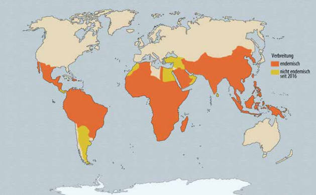 Die Malaria ist in fast allen tropischen, aber auch in subtropischen Ländern, allerdings nicht oberhalb von 2.500 Meter beziehungsweise oberhalb von 1.500 Meter in den Tropen und vor allem im subsaharischen Afrika (Nr. 1 Kenia), in Südostasien, in Zentral- und Südamerika sowie im Südpazifik verbreitet (endemisch). Weltweit ist die Malaria in 84 Ländern mit zusammen mehr als drei Milliarden Menschen endemisch. Im Jahr 2020 wurden in Deutschland 366 Fälle gemeldet, die zu 94 Prozent der Infektionen in Afrika erworben wurden. Dies stellt einen markanten Rückgang der Fallzahlen infolge der Reisebeschränkungen bedingt durch die COVID-19-Pandemie dar. Abbildung 3 zeigt die weltweite Verteilung der Malaria.